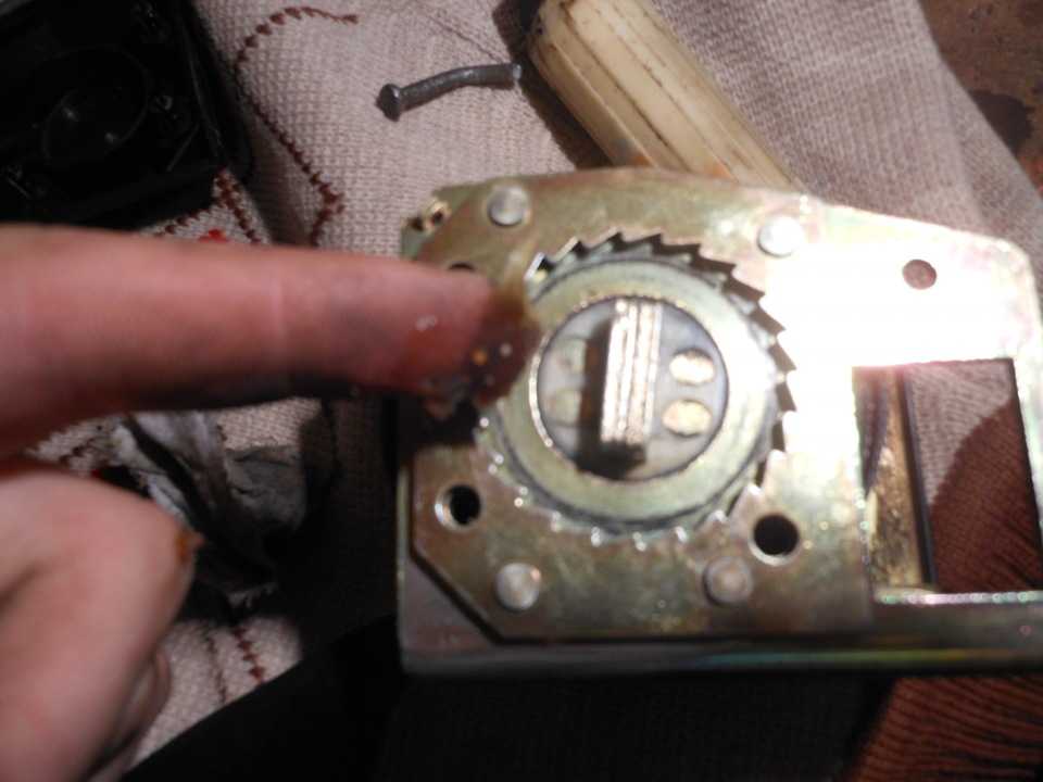 5.Добравшись до трущихся деталей удаляем загустевшую смазку, которая похоже на сухую субстанцию и только мешает четкой работе блокирующего механизма.