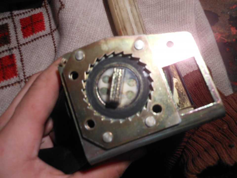 Вы увидите, что в самом центре зубчатого отверстия расположен эксцентрик с зубчиками. Именно он и заклинивает ремень, если его резко выдернуть. Пространство под этим устройством следует хорошенько очистить. Для этого просто необходимо налитьчуть-чуть бензина по всему периметру отверстия, а так же в центр. При этом необходимо снять прищепку с ремня, а одной рукой придерживая ремень, чтобы он не сматывался.
