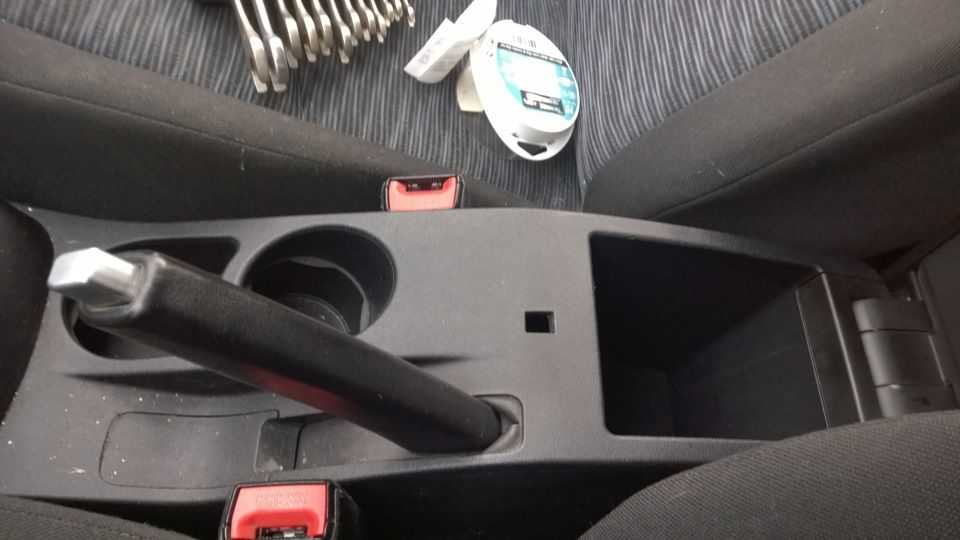 Если число щелчков больше, то ручник нужно подтянуть. Для доступа к гайке, регулирующей натяжение тросов, следует снять заднюю сторону консоли, которая расположена между водительским и передним пассажирским сиденьем. Для того, чтобы снять панель консоли, достаточно выкрутить один шуруп.