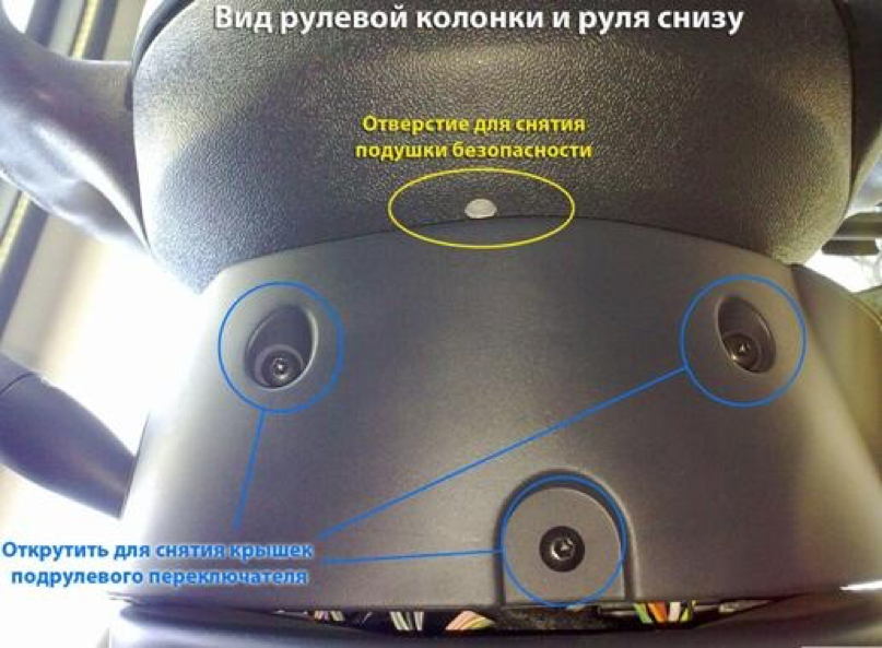 4. Снимаем подушку. Тут главное не дергать сильно – она висит на проводах.5. Маркируем болт крепления руля. Это делается для себя чтоб знать как поставить руль (там есть штатная насечка) и до какого угла затянуть болт обратно.6. Отсоединяем контакты земли и клаксона.7. Снимаем медиа-джойстик.8. Отжав винт стягивающий стяжку крепления подрулевого, нажимаем на него и снимаем подрулевой.