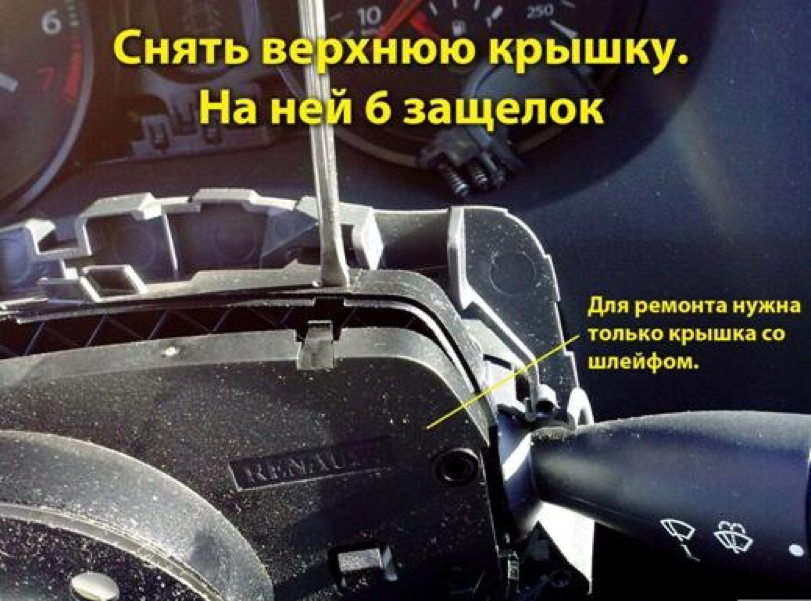 Руль в Меган Меган 2 демонтирован. После демонтажа руля аккуратно снимаем медиа-джойстик. Сначала выкручиваем крепящий его винт, а затем сдвигаем конструкцию вверх. После отсоединения крепежа проводки извлекаем подрулевой шлейф, поддев его отверткой. Реставрационные мероприятия Для устранения неисправности подрулевой переключатель подлежит разборке. Чтобы отключить подрулевое, нужно отжать винт, который удерживает стяжку. После этого необходимо замена шлейфа руля рено меган 2 4 винта, которые держат крышку переключателей.