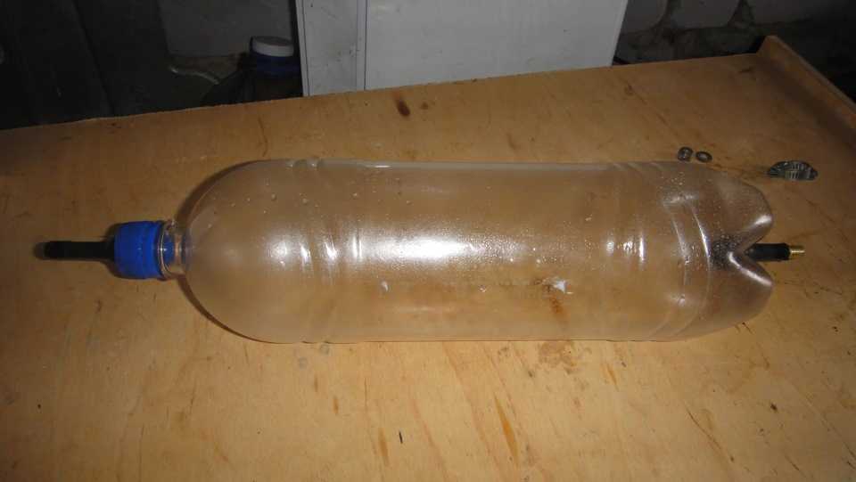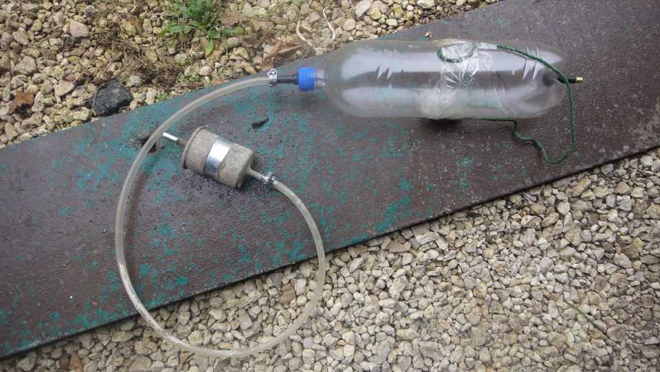 Далее надеваем шланг на ниппель горловины бутылки и закрепляем хомутом, ко второму же концу шланга подсоединяем топливный фильтр и тоже затягиваем хомутом. В полностью собранном виде у нас получается вот такая система.