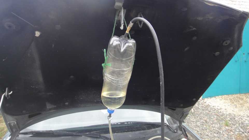 Далее после создания давления в бутылке заводим машину уже на промывочной жидкости и даем ей поработать в режиме.1. 15 минут холостого хода2. 15 минут отдыха.3. Далее дожиг всей оставшейся жидкости в бутылке до тех пор пока двигатель снова не заглохнет.После того как двигатель заглохнул.НЕОБХОДИМО СБРОСИТЬ ДАВЛЕНИЕ В БУТЫЛКЕ ЛИБО НАЖАТИЕМ НА ВЕНТИЛЬ В ДНЕ БУТЫЛКИ ЛИБО НЕБОЛЬШИМ ОТВЕРТЫВАНИЕМ КРЫШКИ БУТЫЛКИ ЧТОБЫ СТРАВИТЬ ДАВЛЕНИЕ.