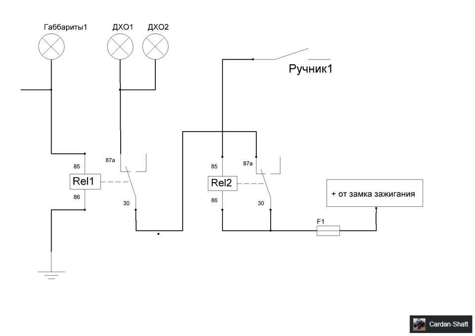 Если такового нет, то потребуется установить реле по цепи ближнего света в соответствии с приведёнными выше схемами. Последняя потребуется для того чтобы стягивать термоусадочные трубки. Схема подключения дневных ходовых огней Если в качестве габаритов у вас установлены лампы накаливания, можете этот принцип использовать для габаритов. Их нельзя применять, если в габаритах установлены светодиоды. Если свет будет слишком ярким, дневные огни будут светить как «габаритки», что недопустимо.