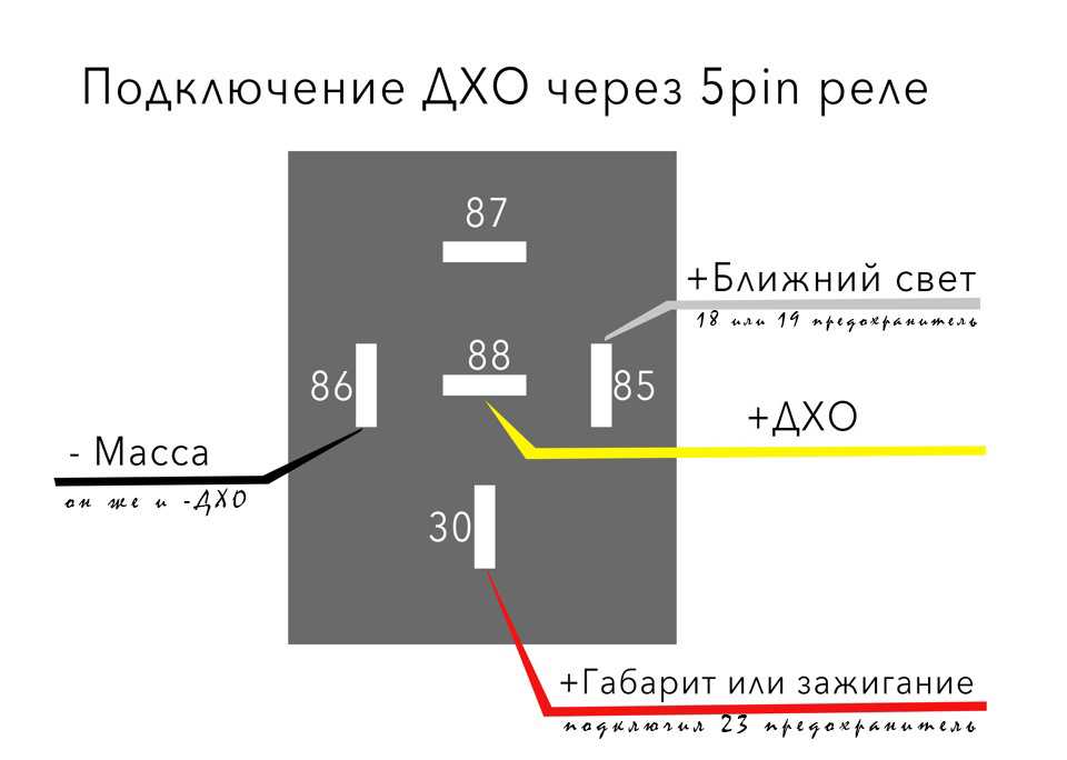При включении ближнего света на минусе ДХО появится плюс и они выключатся, конечно при включении дальнего света они опять заработают. В остальном схемотехника дублируется. Однако далеко не каждые лампы подойдут для использования в качестве ходовых огней.