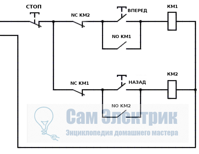 Обратите пристальное внимание на треугольник между силовыми контактами КМ1 и КМ2. Он означает “защиту от дурака”