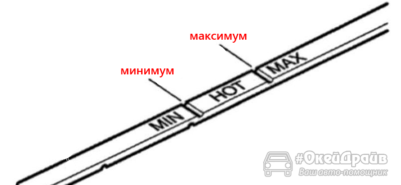 На кончике каждого щупа имеется две отметки. Одна из них (верхняя) показывает максимальное количество масла, которое может быть залито в автомобильный двигатель, а другая (нижняя), говорит о минимальном уровне масла, который допустим при работе данного мотора. Уровень масла должен находиться между этими двумя отметками. Если количество масла находится на уровне около нижней отметки, требуется срочно долить новое моторное масло, но сперва необходимо убедиться, что старое продолжает грамотно исполнять возложенные на него обязанности. Стоит отметить, что в большинстве современных автомобилей имеется индикатор уровня масла, который выводит на приборную панель информацию об уровне масла в двигателе.