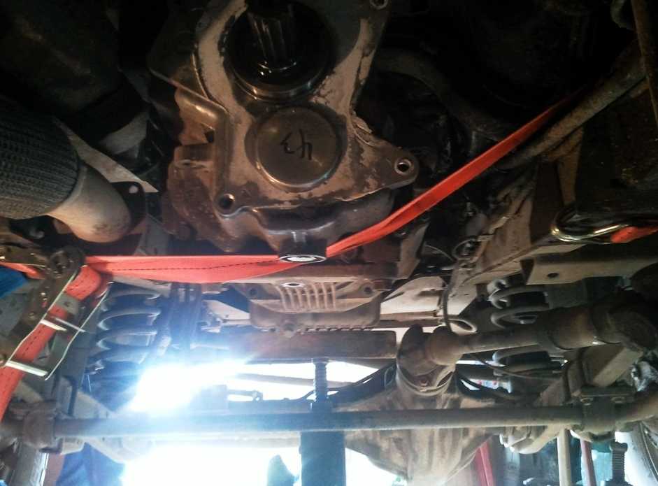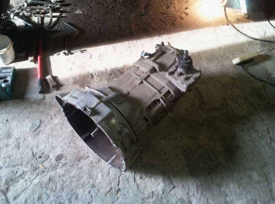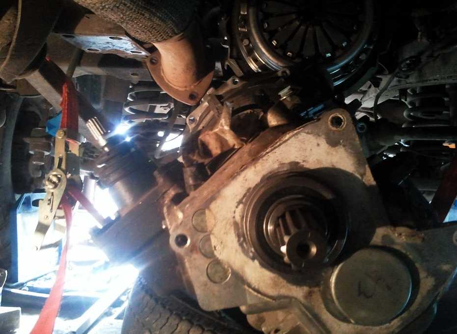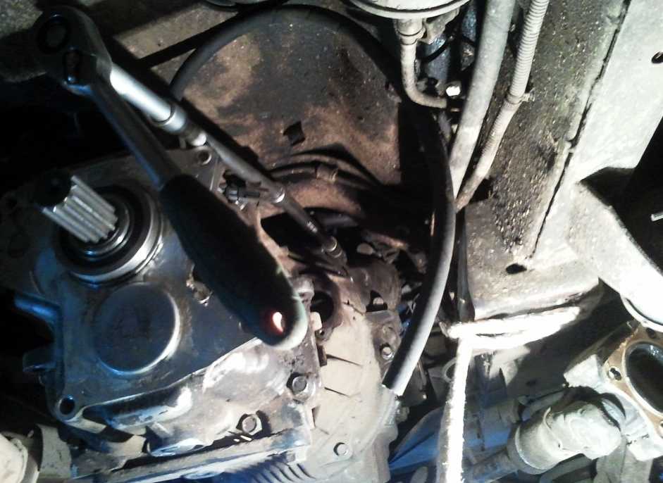 - Снимается катализатор, затем начинается разборка КПП: сливается масло, отсоединяется трос ручника, отключаются штекеры, откручиваются болты.