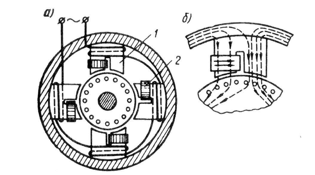 двигателях иногда применяют конструкцию с явно выраженными полюсами и однофазной