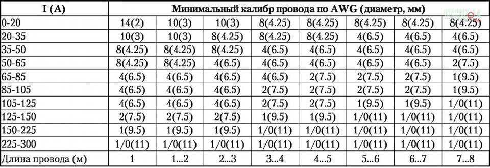При выборе сечения кабеля можно руководствоваться таблицами, которые есть в правилах любых автозвуковых соревнований