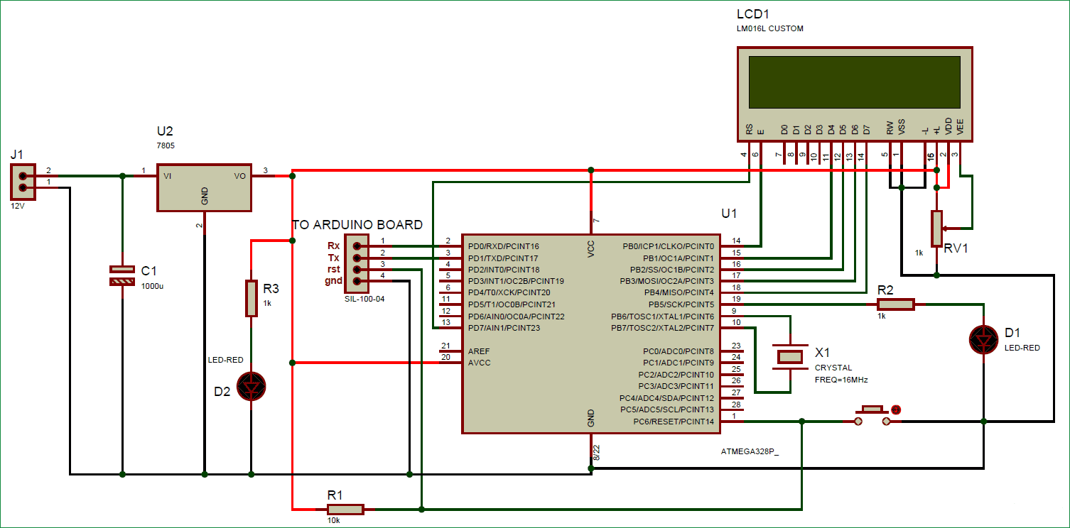 Вставьте ‘New IC’ (ваш микроконтроллер) в эту плату. Также вы сможете собрать всю эту систему сразу на печатной плате. Для подключения жидкокристаллического дисплея соедините вашу собранную плату Arduino с оригинальной платой Arduino, используя контакты Rx, Tx, RST and GND оригинальной платой Arduino, как показано ниже на мнемонической схеме или выше на схеме соединений. И загрузите приведенный ниже код.