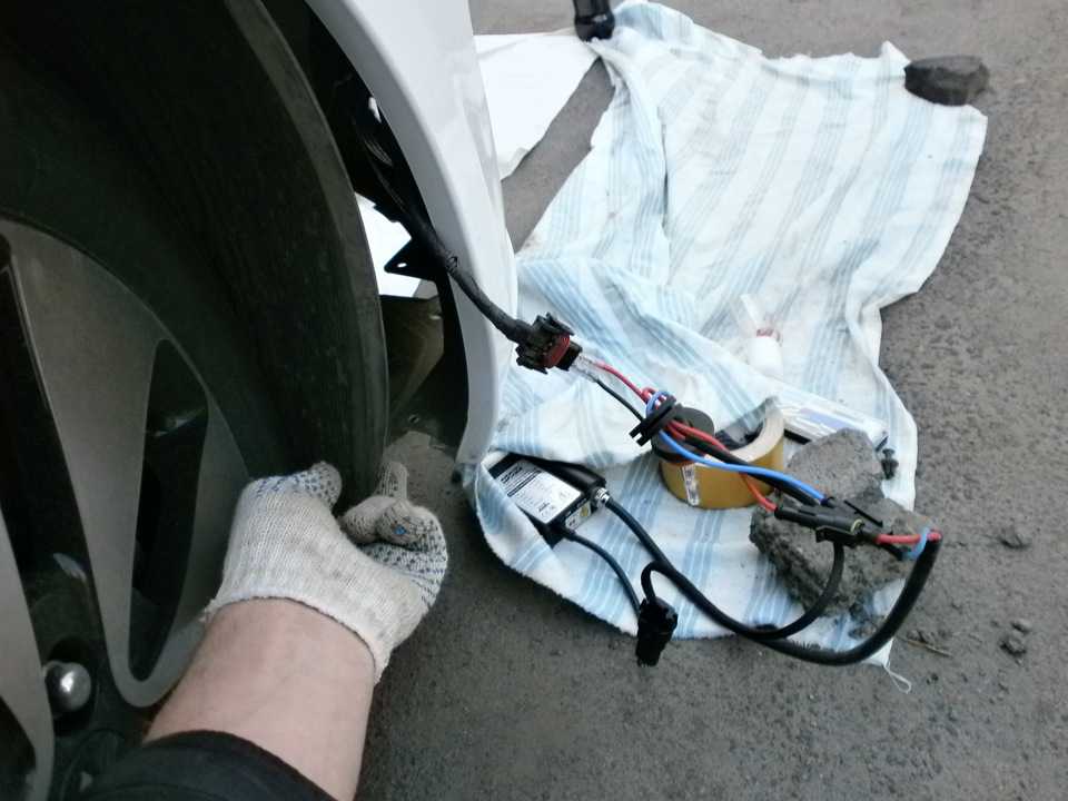 Устанавливаем фары на место, предварительно вернув защитную крышку. Блоки розжига желательно максимально удалить от двигателя. Для того, чтобы защитить блок розжига от попадания воды. Рекомендуют изолировать его полиэтиленом. Но, это лишнее, так как блок герметичен. Как уже говорилось, — проводим коррекцию фар