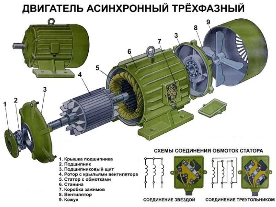 - Треугольники со звездами — 3-х фазная обмотка статоров электромотора соединена согласно схемы треугольник или звезда. Все зависит от напряжения питания сетей. Концы 3-х фазных обмоток могут быть соединенными внутри электромоторов или выводятся наружу, также выводятся в распределительные коробки.