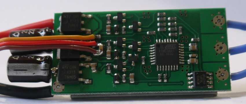 - Датчик положения с микроконтроллером. Управление бесколлекторным двигателем постоянного тока осуществляется с помощью AVR ядра (чипа для выполнения тех или иных задач). Программа, вшитая в плату AVR, максимально быстро запускает двигатель при отсутствии дополнительных внешних приборов и управляет скоростью.