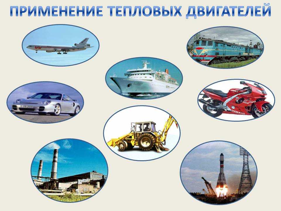 Тепловые машины широко используют на производстве и в быту. По железнодорожным магистралям водят составы мощные тепловозы, по водным путям – теплоходы. Миллионы автомобилей с двигателями внутреннего сгорания перевозят грузы и пассажиров. Поршневыми, турбовинтовыми и турбореактивными двигателями снабжены самолеты и вертолеты. С помощью ракетных двигателей осуществляются запуски искусственных спутников, космических кораблей и станций. Двигатели внутреннего сгорания являются основой механизации производственных процессов в сельском хозяйстве. Их устанавливают на тракторах, комбайнах, самоходных шасси, насосных станциях.