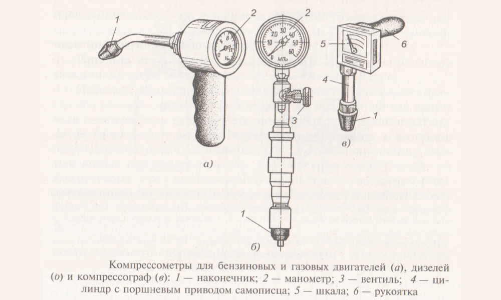 Давление необходимо измерять на прогретом двигателе, пользуясь специальным манометром — компрессометром. Приборы бывают прижимного и резьбового типа. Первые надо прижимать руками, вторые завинчиваются поочередно в каждый цилиндр. Измерения производятся так: