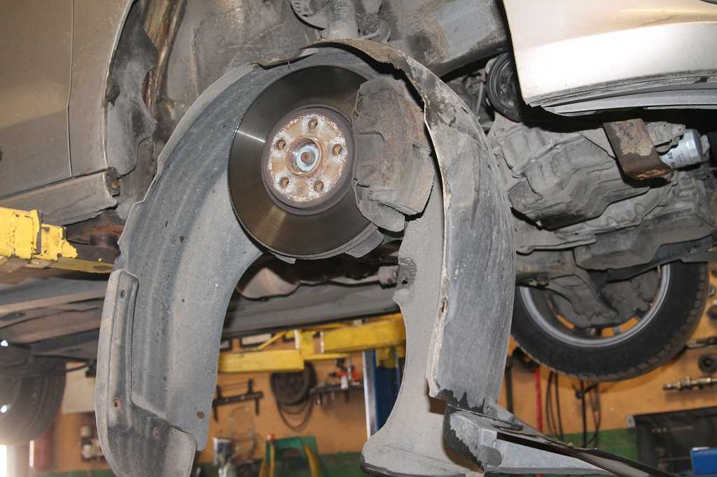 - Далее следует демонтировать переднее колесо с правой стороны машины, подкрылок. Это нужно для доступа к шкиву на коленчатом валу.