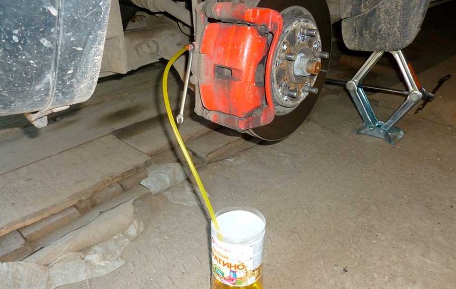 - Снимите заднее левое колесо, очистите штуцер на суппорте и наденьте на него тонкую прозрачную трубку, опущенную в сосуд для сбора отработанного материала. В качестве сосуда подойдёт пластиковая бутылка с пробкой, в которую необходимо вставить шланг. Бутылку закрепите немного выше уровня штуцера. Это предотвратит всасывание воздуха в случае ошибки помощника, надавливающего на педаль.
