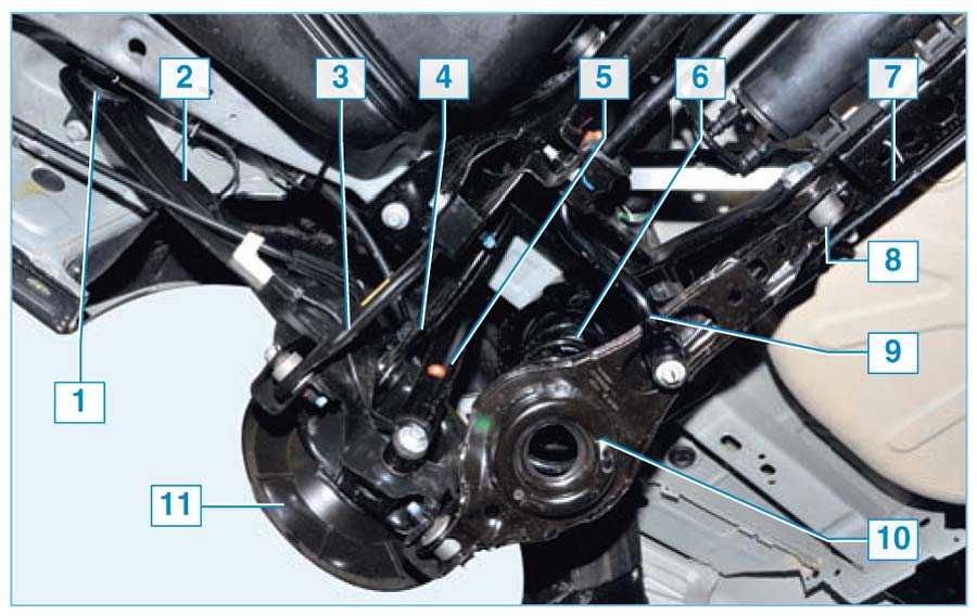 Задняя подвеска:1 — продольный рычаг; 2 — амортизатор; 3 — подрамник; 4 — стабилизатор поперечной устойчивости; 5 — регулировочный болт (болт крепления заднего нижнего рычага к подрамнику); 6 — нижний задний рычаг; 7 — пружина; 8 — тормозной щит; 9 — верхний рычаг; 10 — нижний передний рычаг; 11 — сайлент-блок продольного рычага