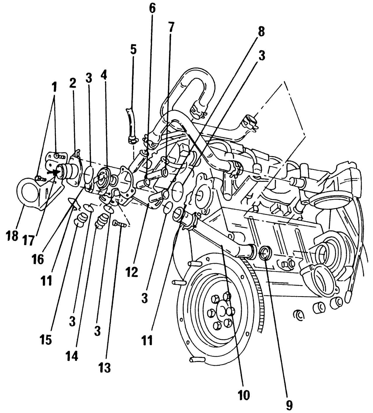 Рис. 101. Детали системы охлаждения: 1 — болты; 2 — соединительный штуцер; 3 — уплотнительное кольцо круглого сечения; 4 — термостат; 5, 6 — к расширительному бачку; 7 — к теплообменнику; 8 — от теплообменника; 9 — уплотнительное кольцо (всегда заменять); 10 — труба циркуляции охлаждающей жидкости; 11 — предохранительный зажим; 12 — корпус термостата; 13 — болт, 10 Н·м; 14 — датчик перегрева с термодатчиком указателя температуры; 15 — пробка; 16 — к верхней стороне радиатора; 17 — к нижней стороне радиатора; 18 — хомут |