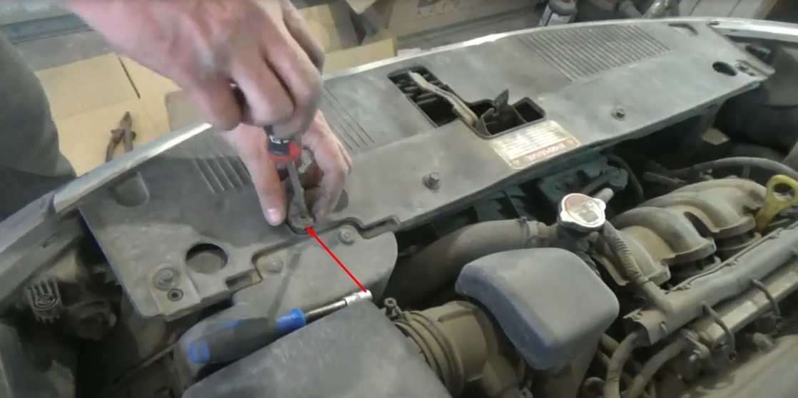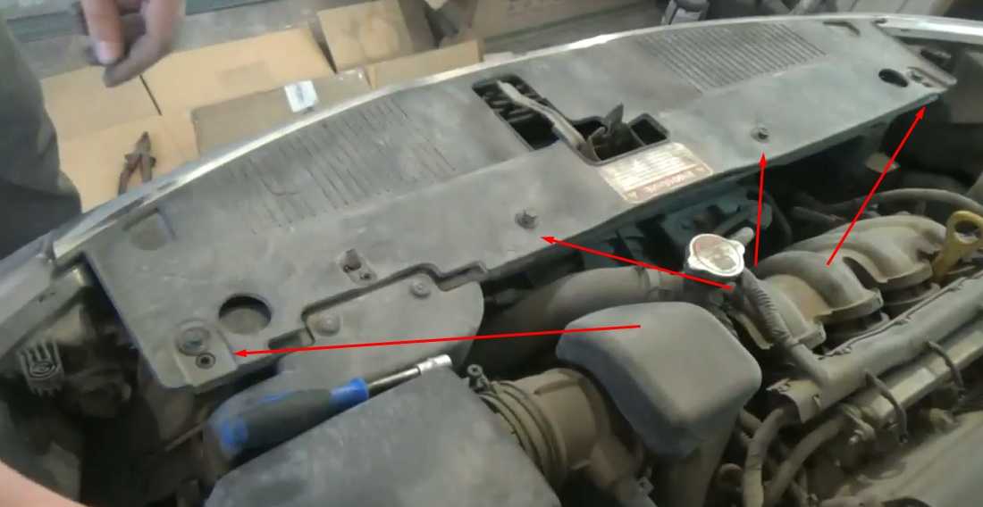 Вначале необходимо открутить четыре крепежных элемента в моторном отсеке.