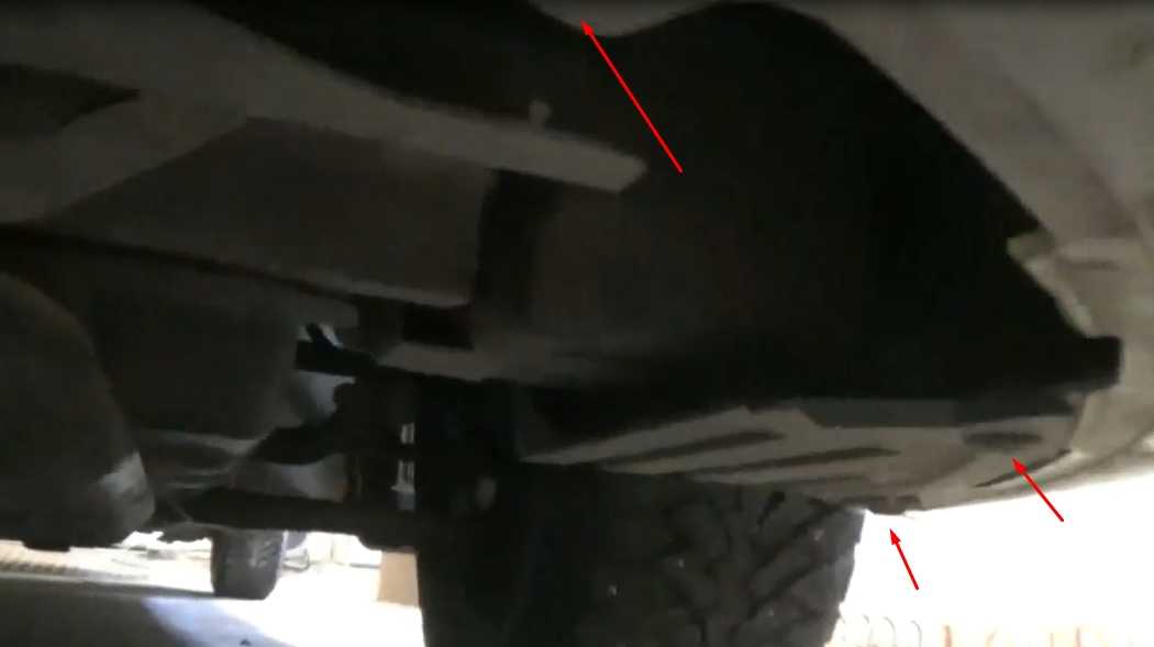 - Следующий шаг – откручивание шурупов из колесных арок. Для этого необходимо повернуть колеса в сторону. После этого защиту можно полностью снять.