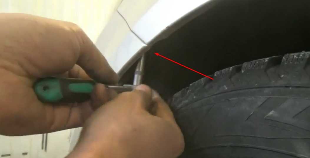 3. В колесной арке с обеих сторон выкрутите по одному саморезу крепления бампера к крылу. Саморез под головку на десять. Для удобства работы можно выкрутить руль в крайнее положение.