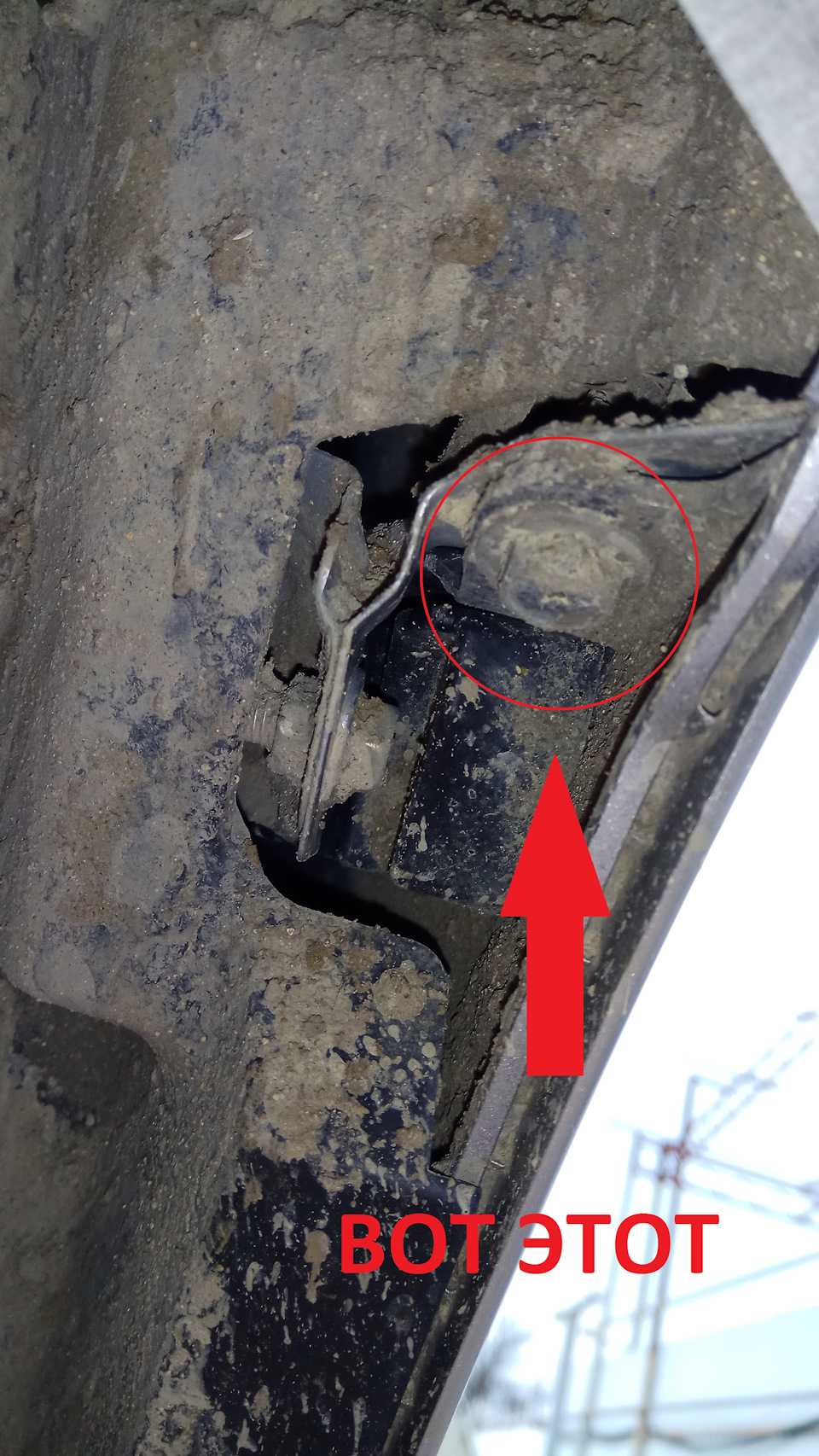 - Также под колесами присутствует «грязевой» болт, который сразу можно и не заметить. Когда он откручен, можно оттянуть грязевик и удалить оставшиеся болты крепления.