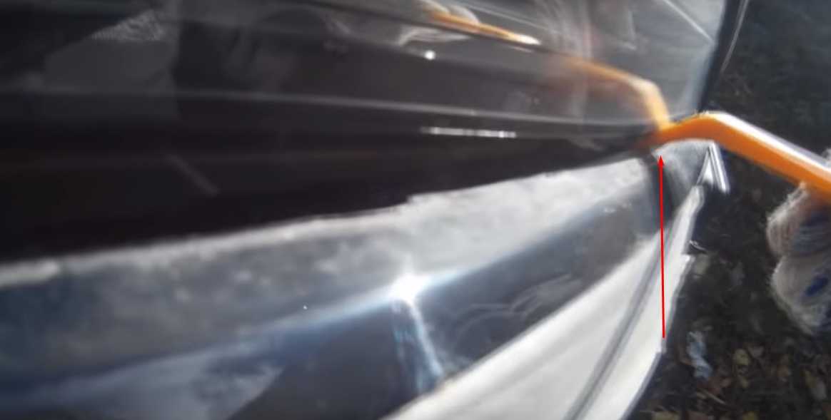 9. С помощью пластиковой лопатки разъедините по две защелки бампера снизу фар.