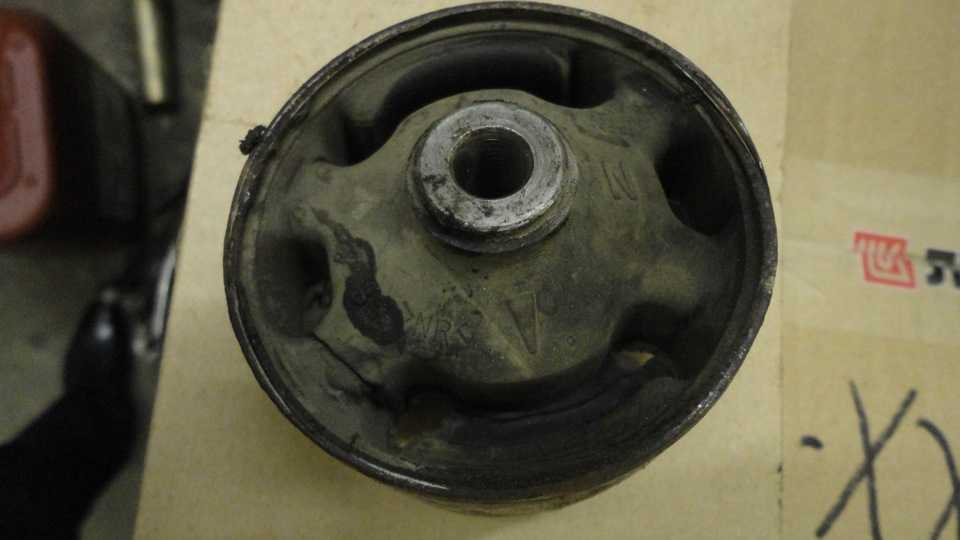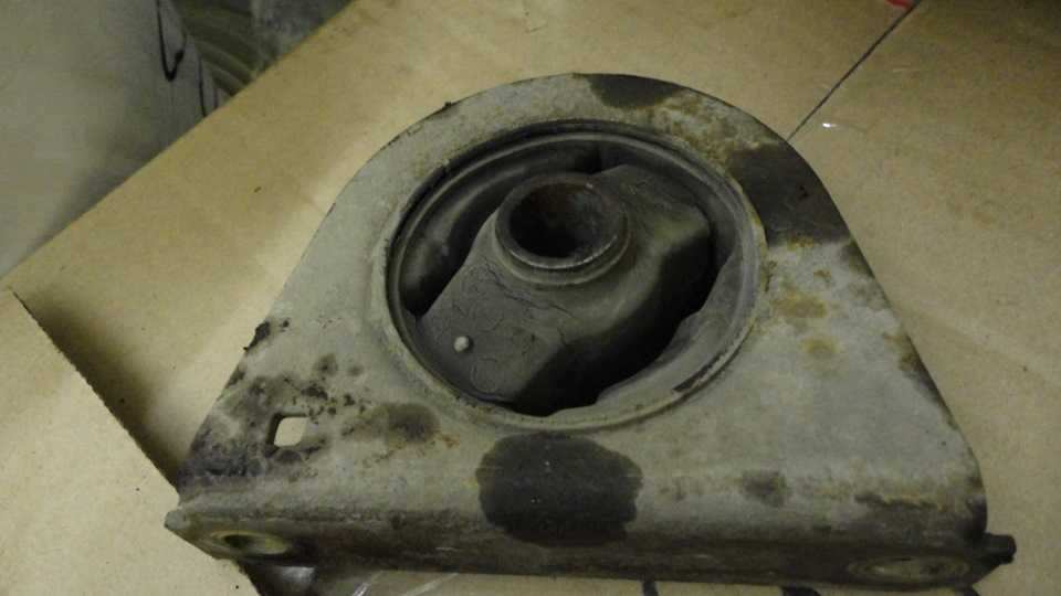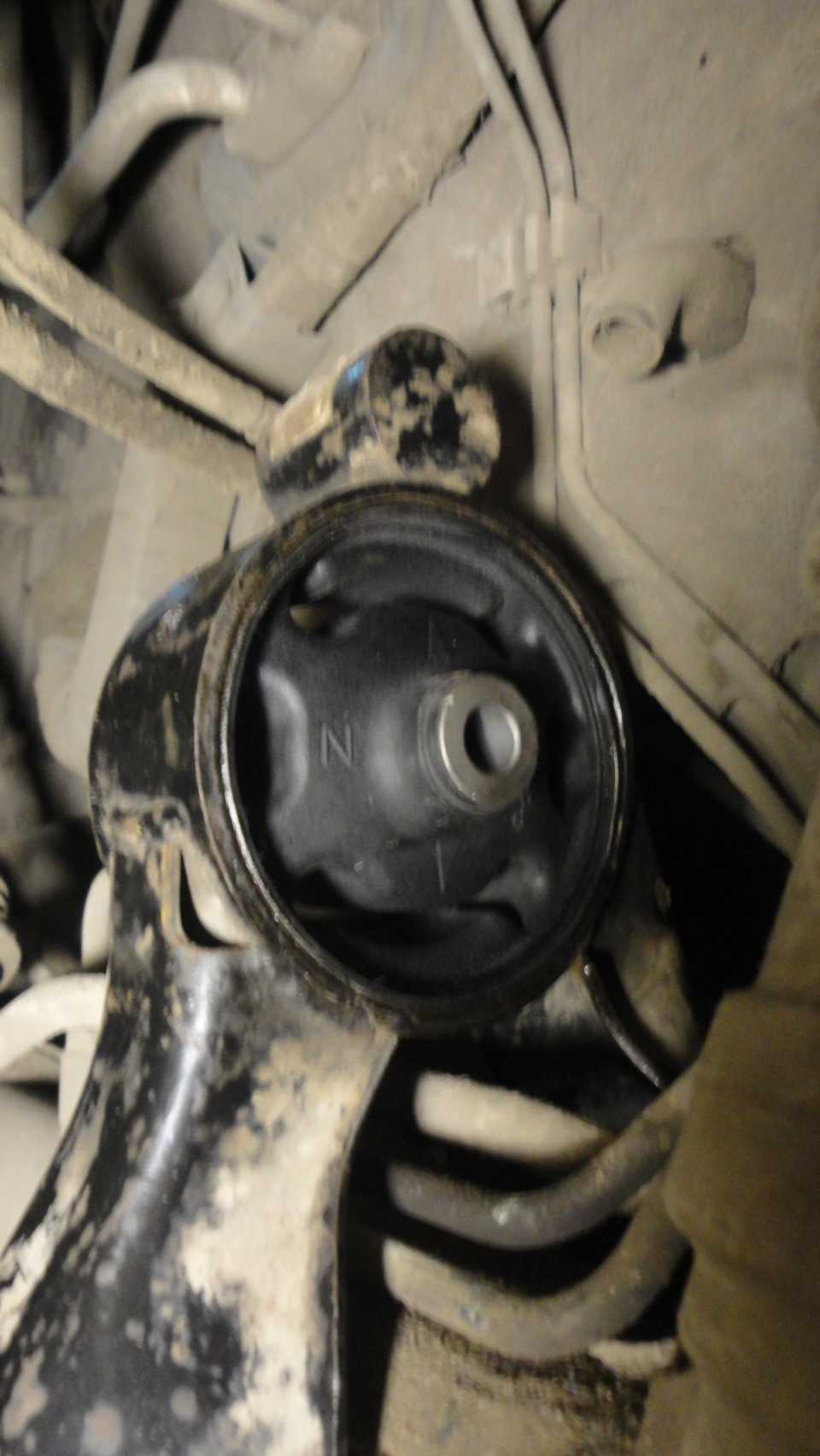 - Самая трудоемкая часть – это демонтаж задней подушки двигателя. Первым делом фиксируем из смотровой ямы основной болт и откручиваем его в подкапотном пространстве (сверху). Остальные болты (3 штуки) скручиваем снизу. Оставляем узел подушки в таком состоянии.