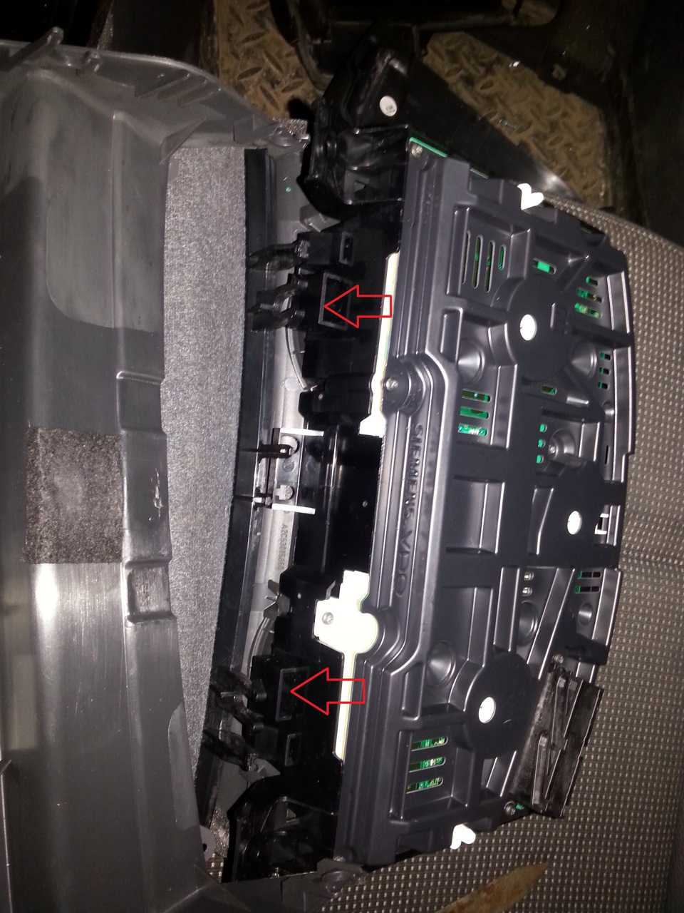 После снятия приборной панели нужно открутить пять винтов и демонтировать защитный кожух. После этих действий производится снятие рамки приборки со стеклом — вам потребуется отогнуть пять защелок и, используя отвертку, поддеть рамку, после чего произвести демонтаж щитка с платой
