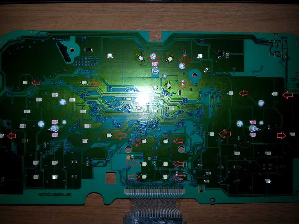 И кстати если вы установили некое дополнительные функции вашего автомобиля и она не идентифицируется на панели, то убедитесь впаян ли туда светодиод. Как видно на моей панели нет светодиодов для фаркопа, патронника и т.д.