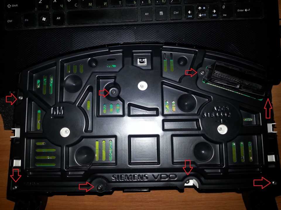 Если надо демонтировать стрелки, то для начала положите на саму шкалу лист бумаги, после чего осторожно подденьте стрелку отверткой. Сняв стрелки, можно произвести демонтаж самой микросхемы, чтобы сделать это, отогните четыре стальных фиксатора на одометре, а также четыре пластмассовых защелки.