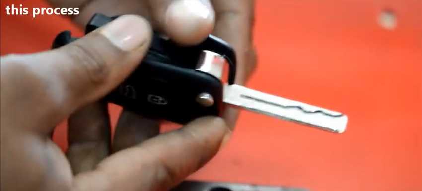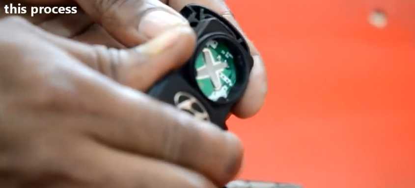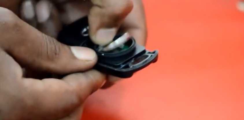 Сначала надо вставить плоский инструмент в выемку возле кнопки закрытия (Lock) и разделить брелок. После этого можно извлечь блок дистанционного управления с элементом питания — батарейкой. Затем надо аккуратно вытолкнуть старую батарейку из гнезда.