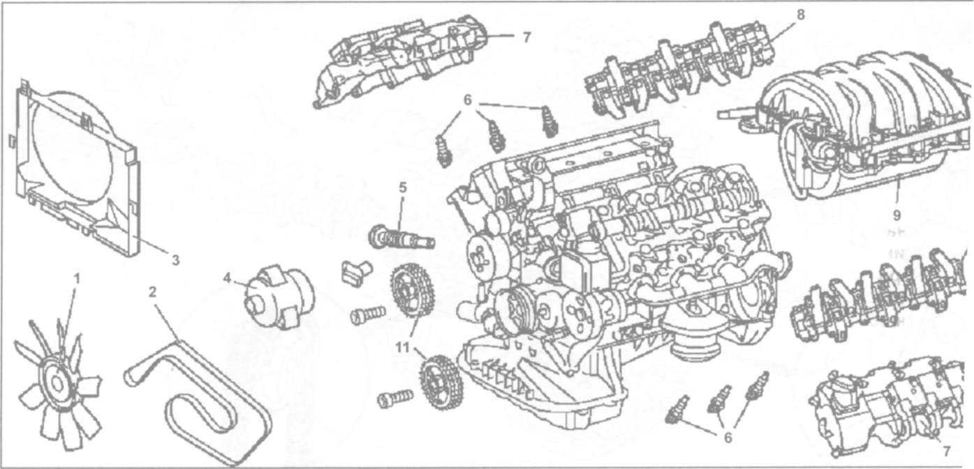Снятие и установка маслосъемных колпачков (этап 1). 1 — вентилятор и вязкостная муфта в сборе 2 — ремень привода навесных агрегатов, 3 — диффузор вентилятора, 4 — генератор, 5 — натяжитель цепи привода ГРМ, 6 — свечи зажигания, 7 — крышка головки блока цилиндров, 8 — ось коромысел левой головки блока цилиндров, 9 — впускной коллектор, 10 — ось коромысел правой головки блока цилиндров, 11 — звёздочки привода распределительных валов.