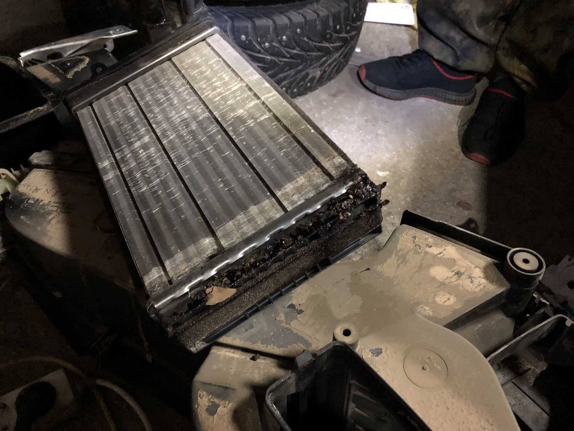 Достать осторожно радиатор печки из корпуса, чтобы не повредить запчасти. Необходимо запомнить последовательность разбора.