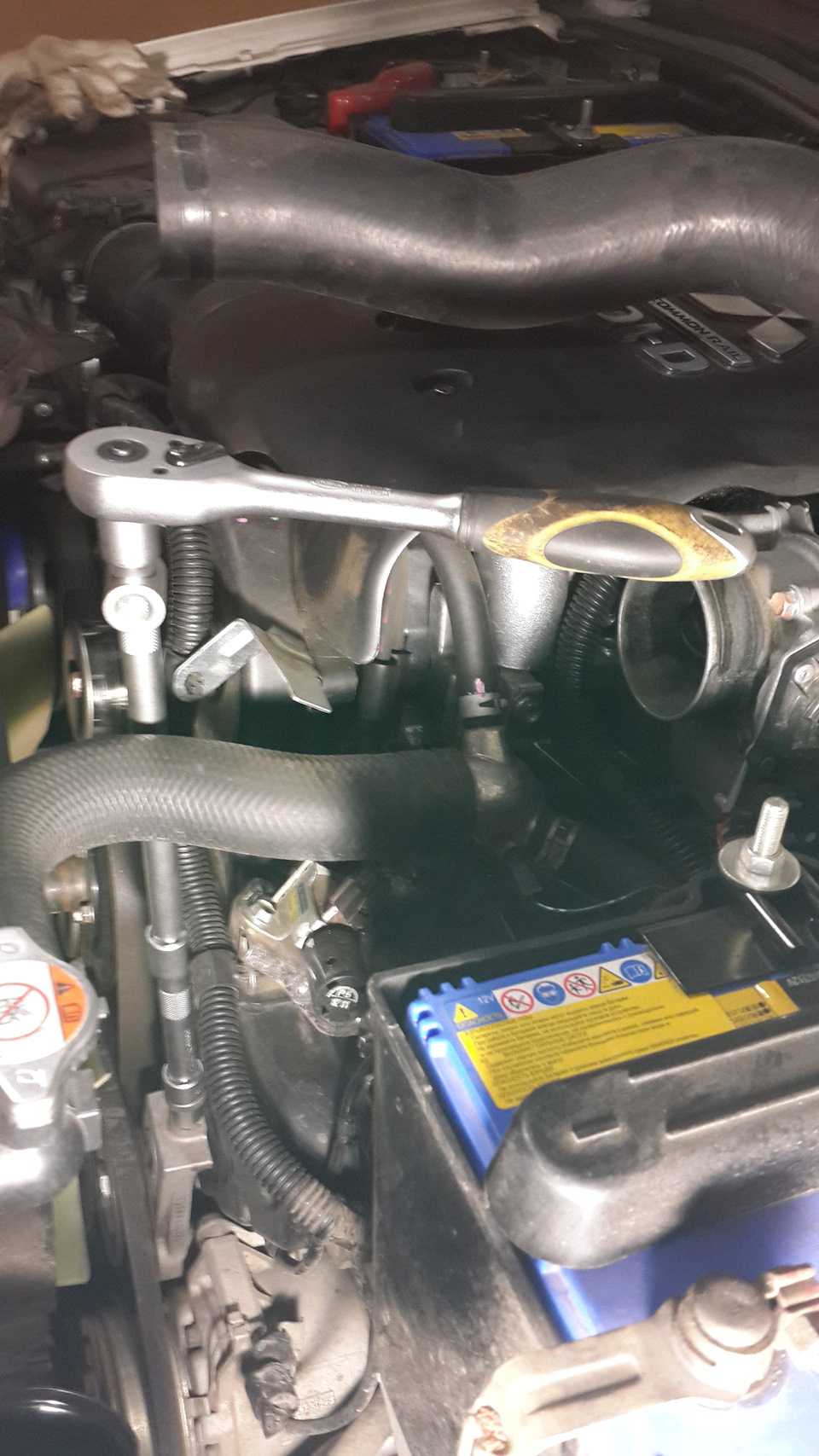 2) максимально ослабляем натяжение ремня регулировочным болтом натяжного ролика (головка на 12 на удлинителях);
