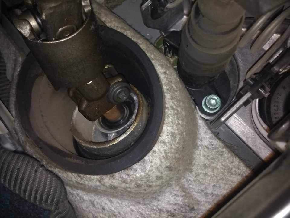 После снятия кожуха под рулем, появится доступ к узлу креплению крестовины к рейке, там расположен болт Т50. Для его снятия придется повернуть руль на 180 градусов, и открутить с другой стороны гайку на 16. Затем повернуть этот болт и извлечь его.
