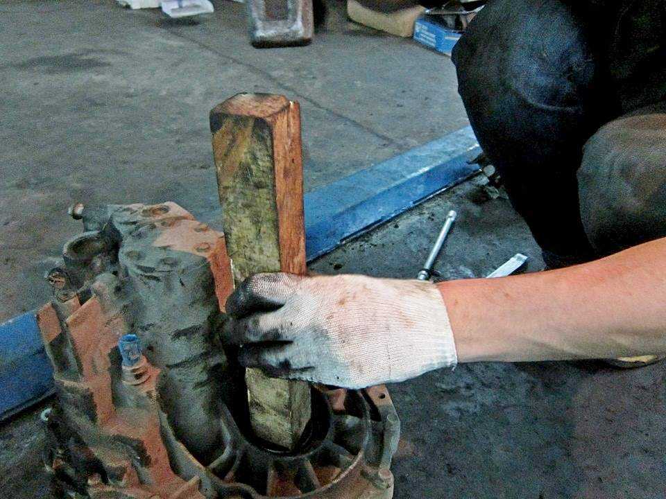 - Установить оправку (брусок или что-то еще) в отверстие, затянуть корзину и демонтировать оправку. После этой процедуры первичный вал коробки будет точно входить в зацепление с диском.