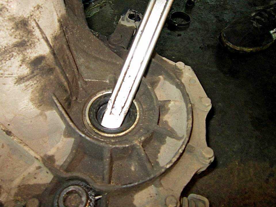 - Разобрать и снять поворотный кулак, а после выдернуть первичный вал из коробки. Для этого понадобится монтировкой его поддеть.