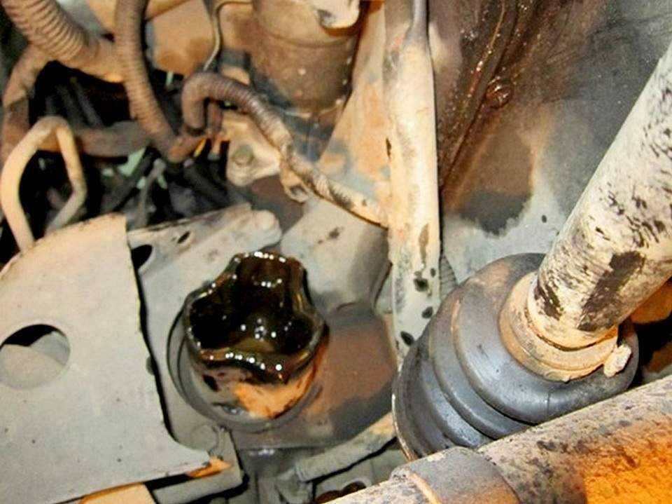 Поменяйте сальник полуоси. Сидит он плотно — подденьте отверткой и извлеките его.