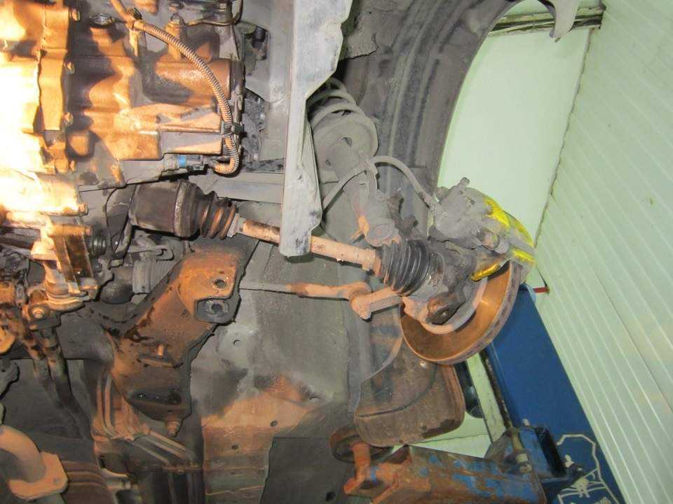 - Перед полным откручиванием болтов, необходимо подпереть коробку переключения передач и двигатель распоркой. В противном случае, силовой агрегат упадет в яму и это вызовет тотальную поломку и двигателя, и коробки передач.