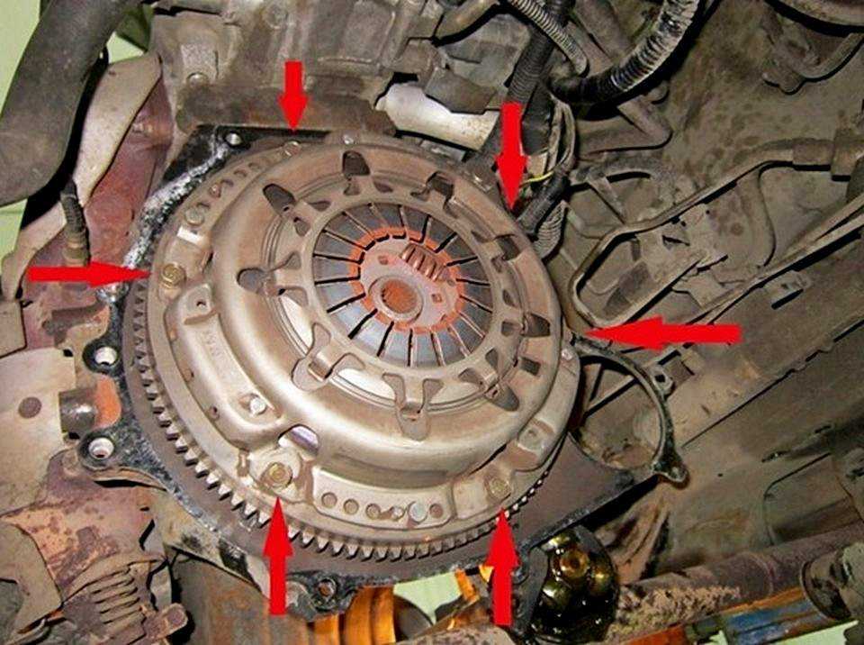 Корзина крепится к маховику 6 болтами, которые нужно выкрутить.