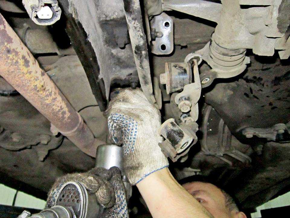 - В задней части выкручиваем крепёжный болт подушки к кронштейну и два между кронштейном и коробкой передач. Это позволит демонтировать балку с двумя подушками. Если они находятся в удручающем состоянии, то меняем их.