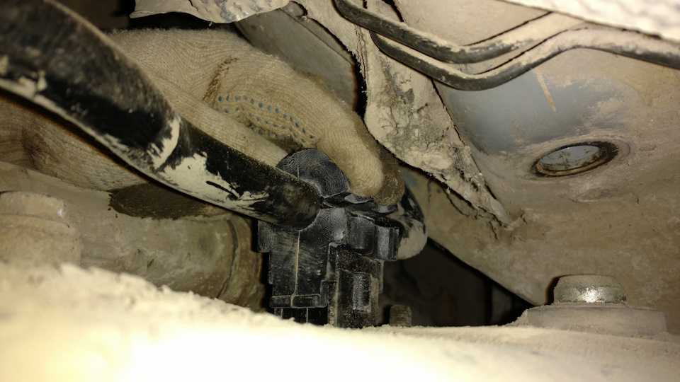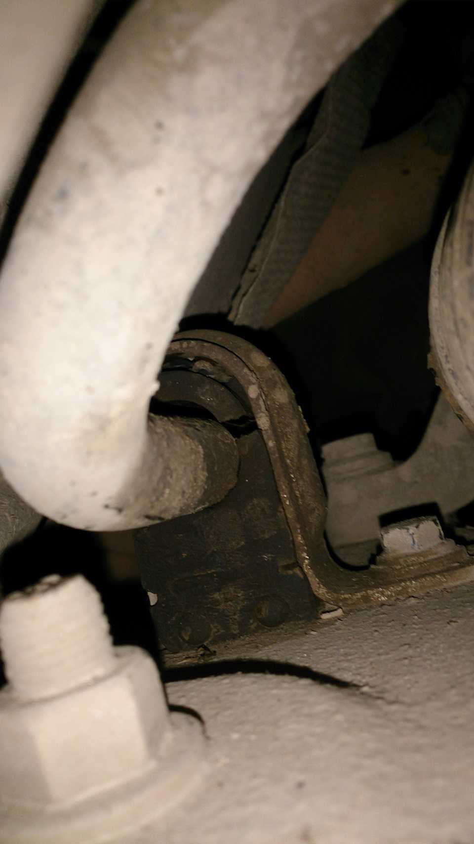 - Далее нужно подлезть под авто и со стороны днища попробовать расшатать подвеску рукой или, если не получается взять монтировку. Необходимо удостовериться в наличии люфта в крепеже стабилизатора. Если он есть, это будет подтверждением разбитого состояния втулок и стойки.