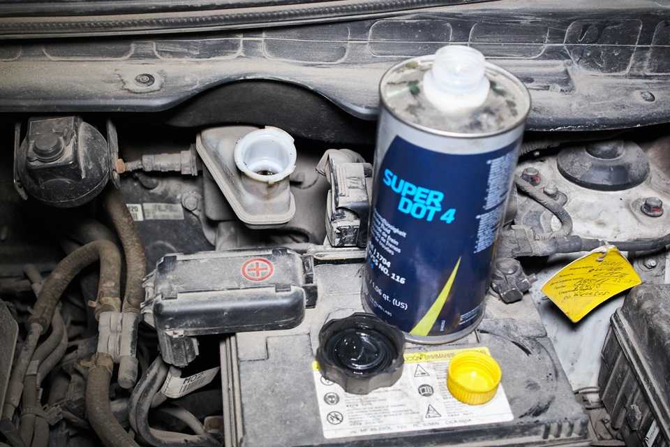 1. Вначале проверяем уровень тормозной жидкости в бачке главного тормозного цилиндра. Если он находится на отметке «MAX» или приближается к ней, откачиваем из бачка часть жидкости. В противном случае она польется через край при установке новых колодок.