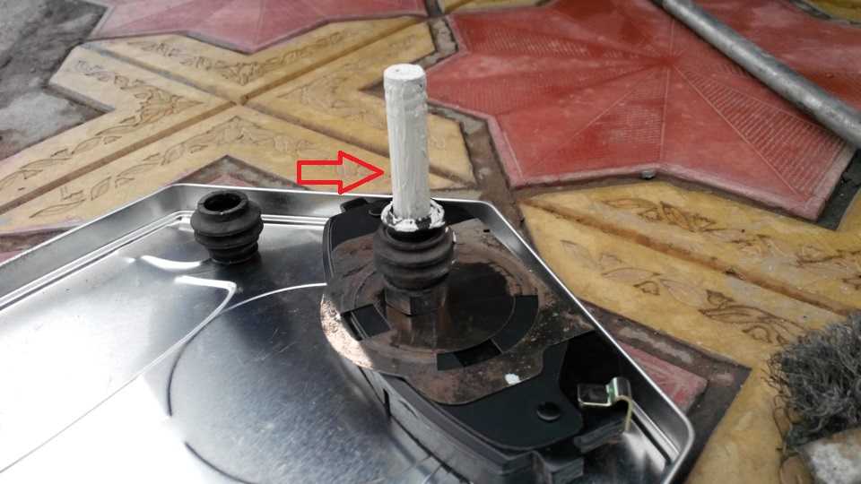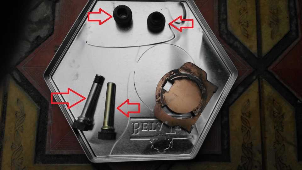 Снимаем и отводим в сторону тормозной цилиндрик. Вытаскиваем старые колодки. Проверяем работу направляющих, в нашем случае нижняя ходит мягко и плавно, верхняя туго. Вытаскиваем её, очищаем и смазываем свежей высокотемпературной смазкой. Берём струбцину или при её отсутствии любой подходящий инструмент и вдавливаем «цилиндрик»: