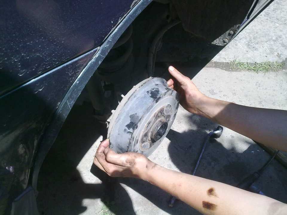 На Нексии еще к выше сказанному, тормозной барабан, может прикипеть к ступице заднего колеса. Что немного усложняет работу. Но, не беда. Берем молоток, желательно из мягкого металла и легко простукиваем барабан. Еще раз, простукиваем часто, но не сильно.