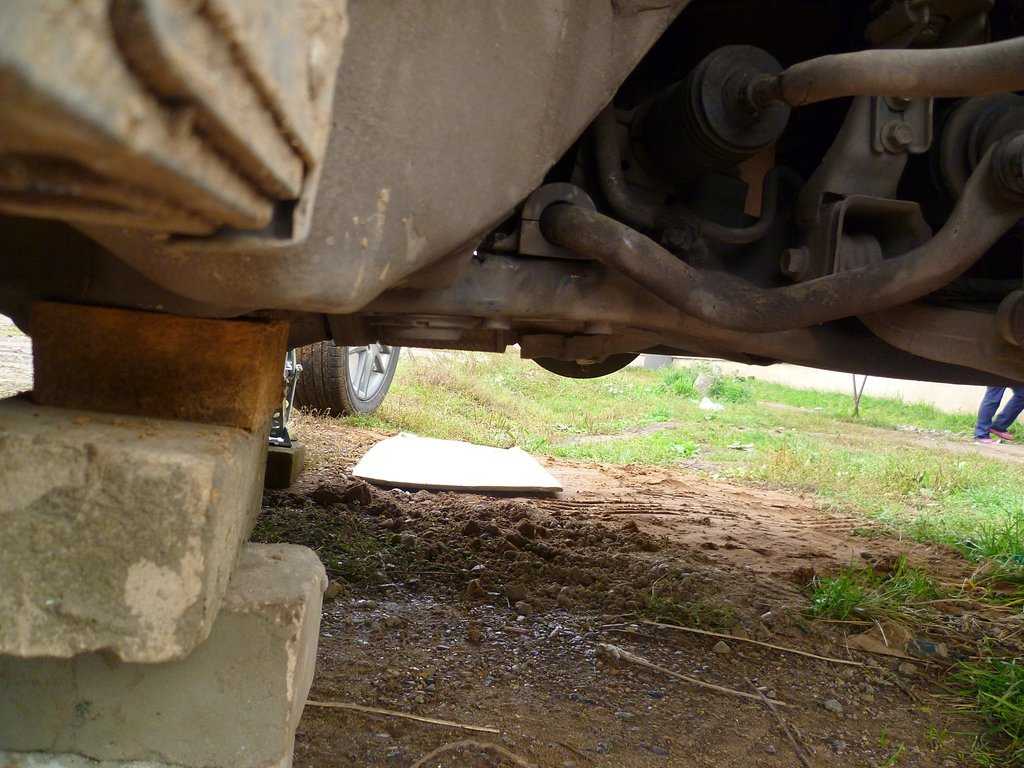 Поднимаем домкратом одну сторону кузова и подкладываем под кузов что нибудь, в моем случае это были кирпичи. Поднимаем домкратом другую сторону кузова.